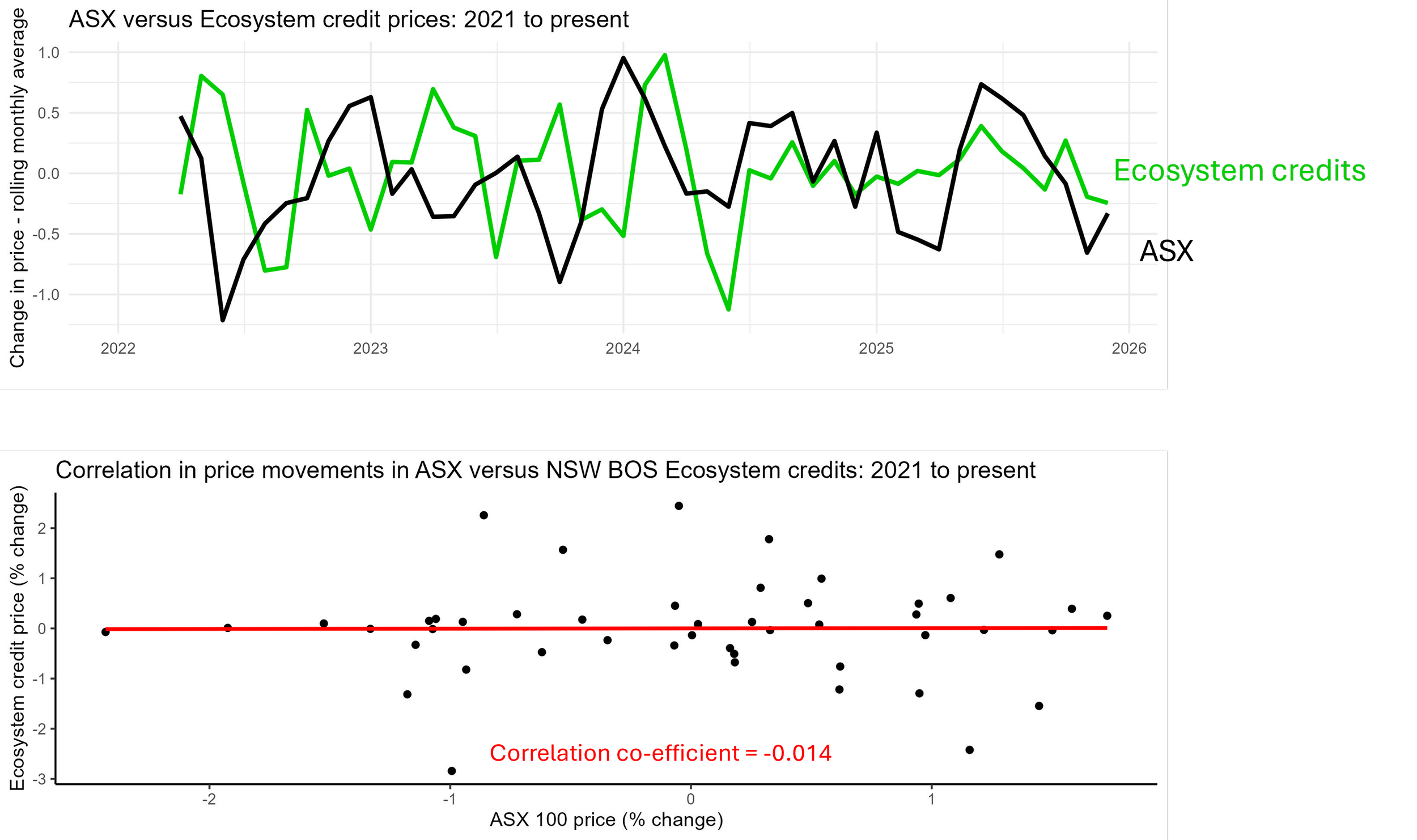 Low or no correlation with traditional financial markets: Returns derive from ecological, regulatory, and project-level drivers, not market multiples. Our analysis shows no correlation between the NSW Biodiversity Credit Market (green) and the ASX (black), with a correlation co-efficient (red) of -0.014: